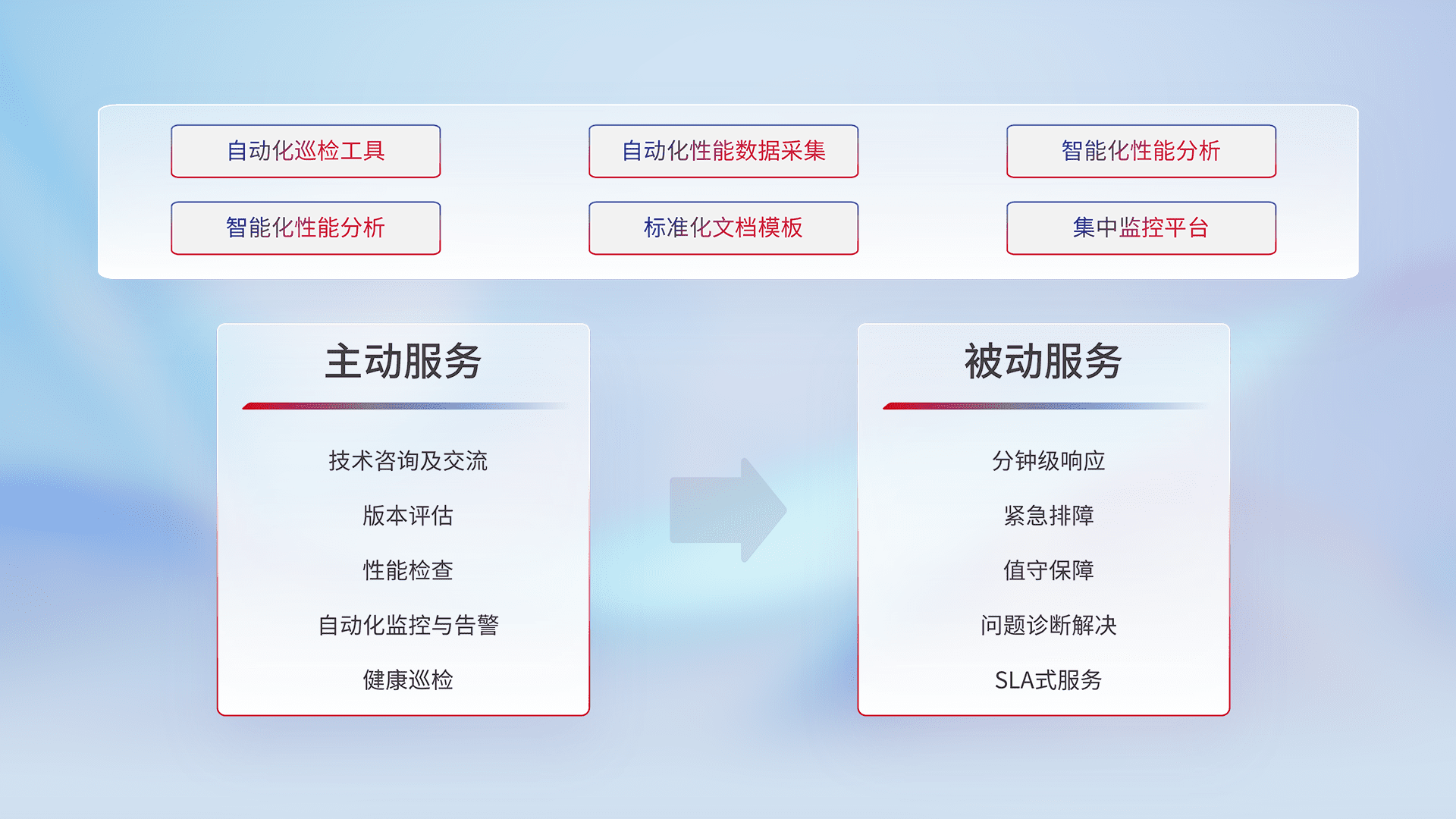 智能化工具和标准化文档,,,,保障服务质量,,,提供主动服务(包含技术咨询、、、、版本评估、、性能检查、、、自动化监控与告警、、健康巡检)和被动服务包含(分钟级响应、、、紧急排障、、、值守保障、、问题诊断解决、、、SLA服务)。。。